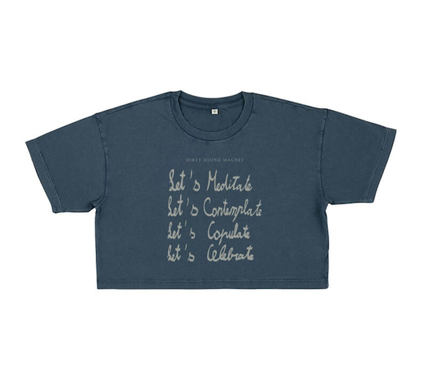 "Let's meditate, let's contemplate, let's copulate, let's celebrate", Lyrics from the song "Meet the Shaman" - Album DSM III, Women's cropped loose fit t-shirt, 100% GOTS Organic Cotton Compact Spun, Discharge printing